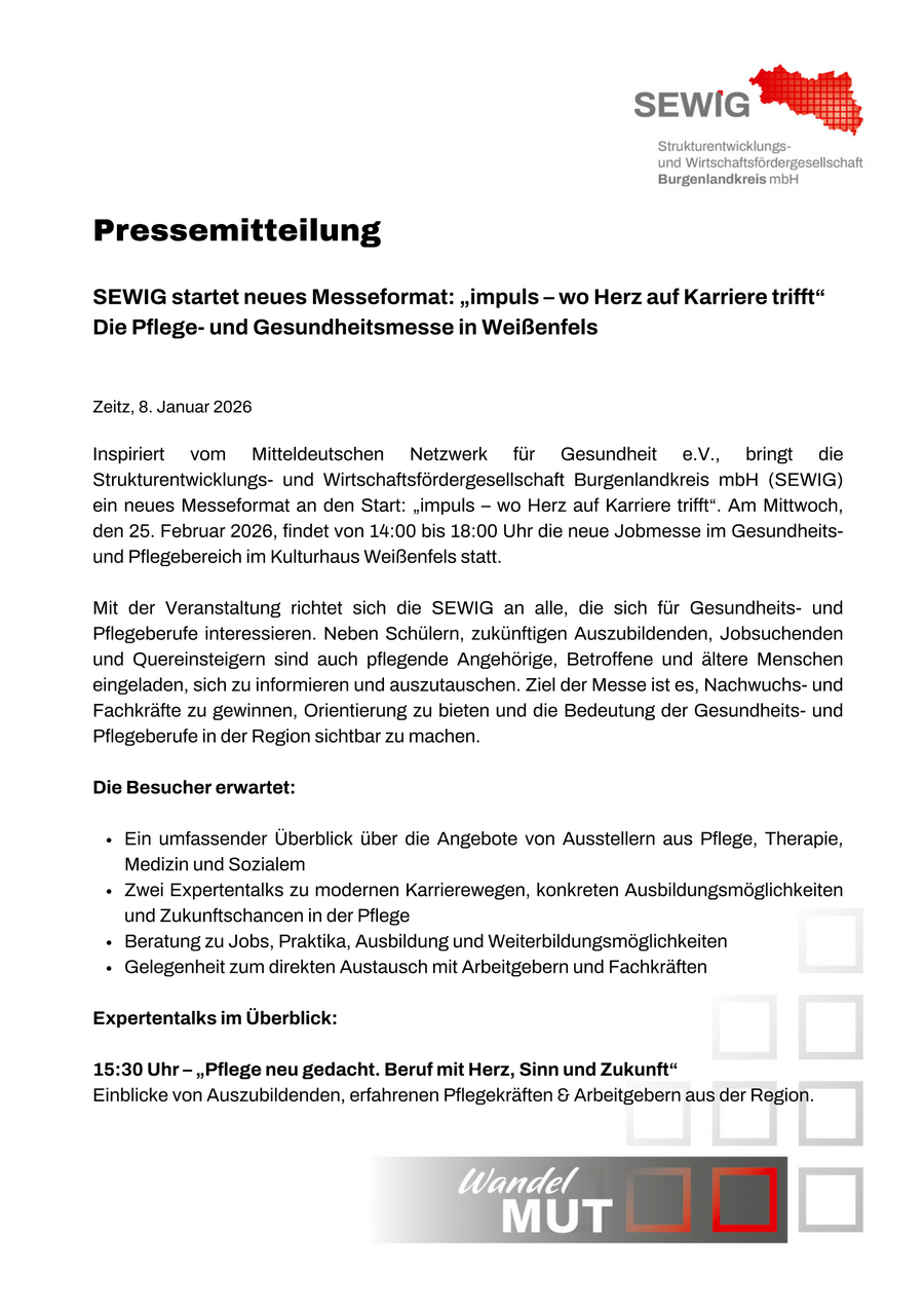 Nico Koch (Pflegedirektor der Asklepios Klinik Weißenfels) gab Einblicke in die Ziele, Arbeitsweise und Aktivitäten der AG Pflege und Gesundheit. Die Mitglieder verschiedener Pflege- und Gesundheitsunternehmen wie z.B. Asklepios Klinik Weißenfels , Stiftung Seniorenhilfe Zeitz sowie Scheunpflug – Wir pflegen, treffen sich regelmäßig in präsenz und digital. Gemeinsam entwickelten sie ein Logo, realisierten gemeinsame Veranstaltungen und setzen sich aktiv v.a. für eine Ausbildungsoffensive in der Pflege hier im Burgenlandkreis ein.