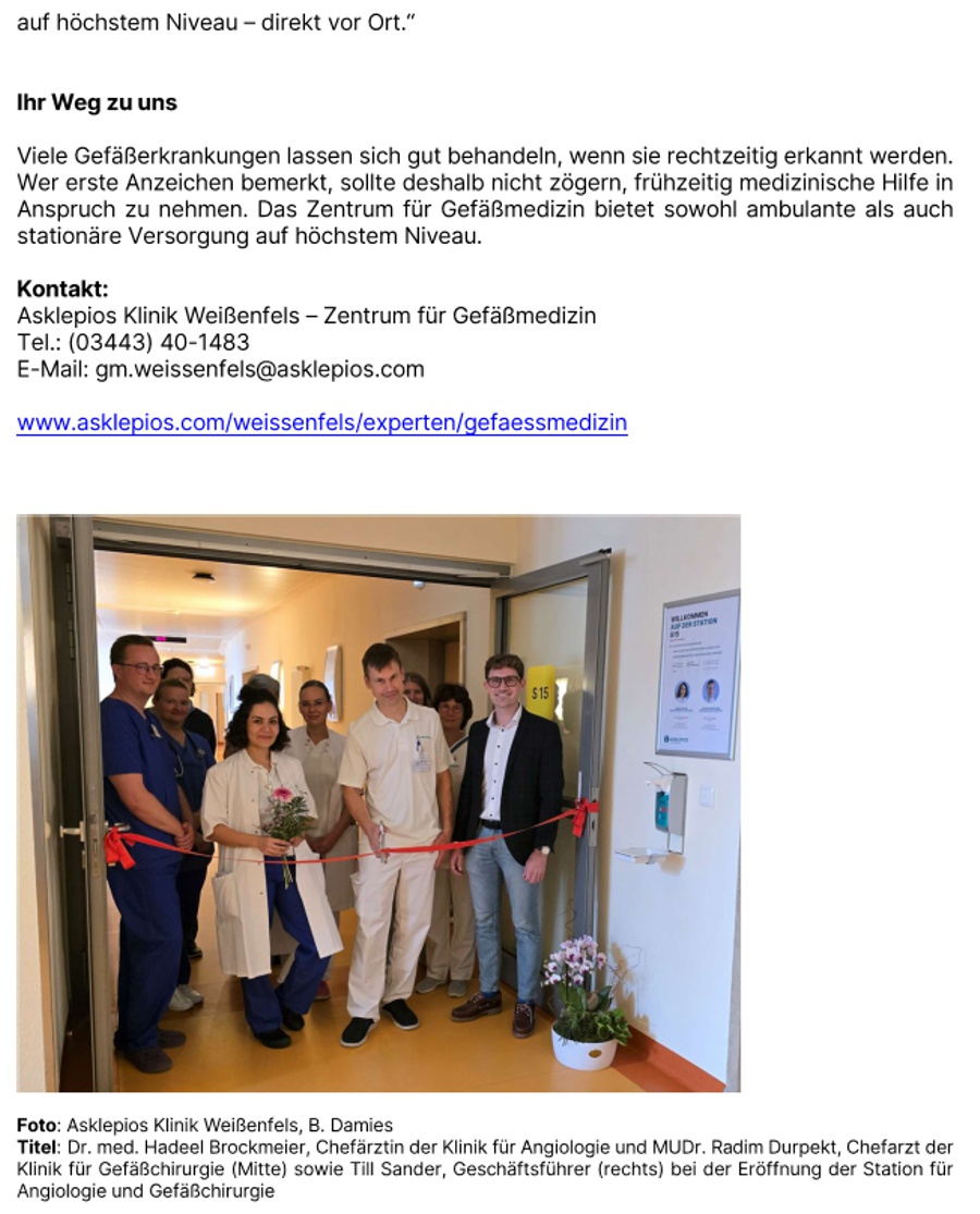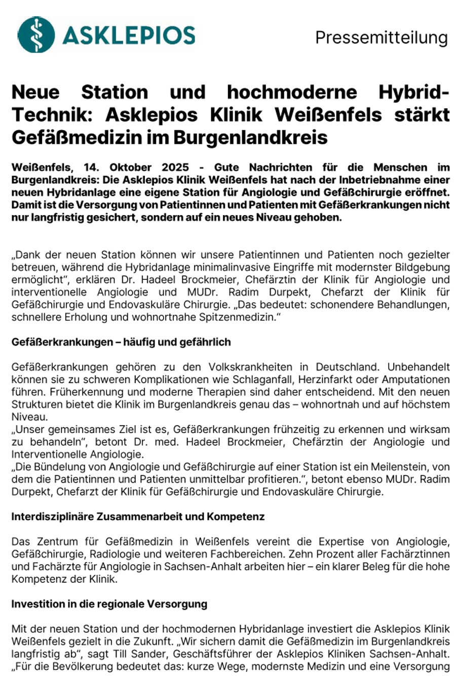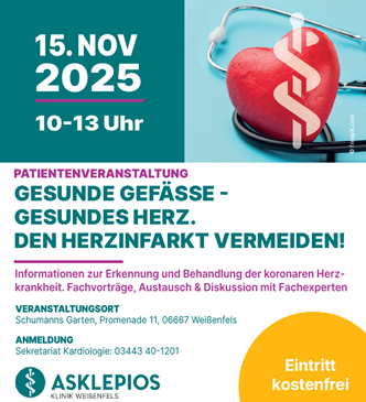 Weißenfels, 30. Oktober 2025 - Im Rahmen der bundesweiten Herzwochen im November 2025, die unter dem Motto „Gesunde Gefäße – Gesundes Herz. Den Herzinfarkt vermeiden!“ stehen, richtet sich der Blick auf die Prävention und Vorsorge bei Herzkrankheiten. Die Asklepios Klinik Weißenfels lädt alle Interessierten zu einer kostenfreien Patientenveranstaltung ein, bei der Expertinnen und Experten wertvolle Informationen zur Herzgesundheit und zu effektiven Vorsorgemaßnahmen bieten.